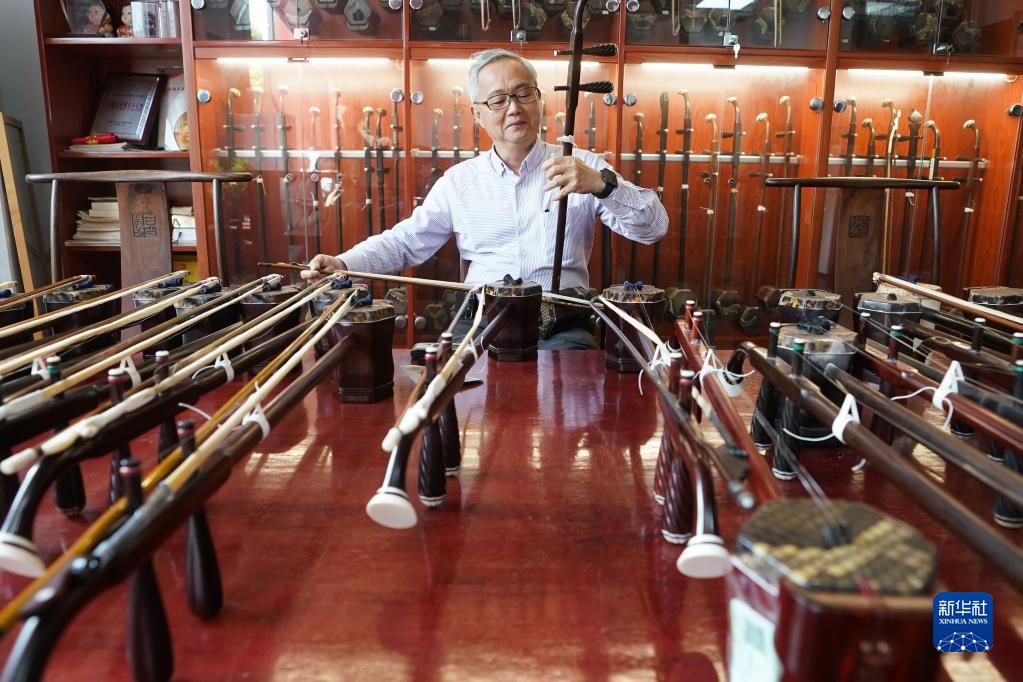 3月28日,在江蘇無(wú)錫梅村街道二胡產(chǎn)業(yè)園古月琴坊車(chē)間,來(lái)自香港的樂(lè )器經(jīng)銷(xiāo)商李開(kāi)在試琴。