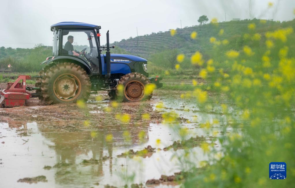 3月28日,在湖南省永州市道縣上關(guān)街道東進(jìn)村,農機手駕駛農機在翻耕稻田。