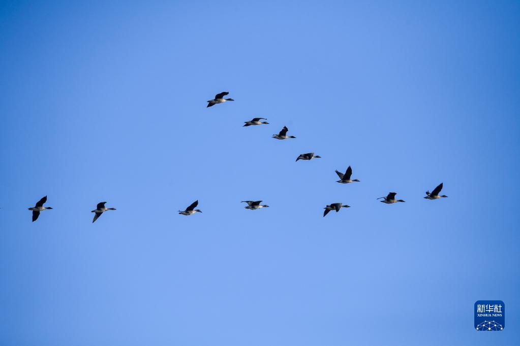 3月28日,在吉林省白城市鎮賚縣,一群豆雁從濕地上空飛過(guò)。