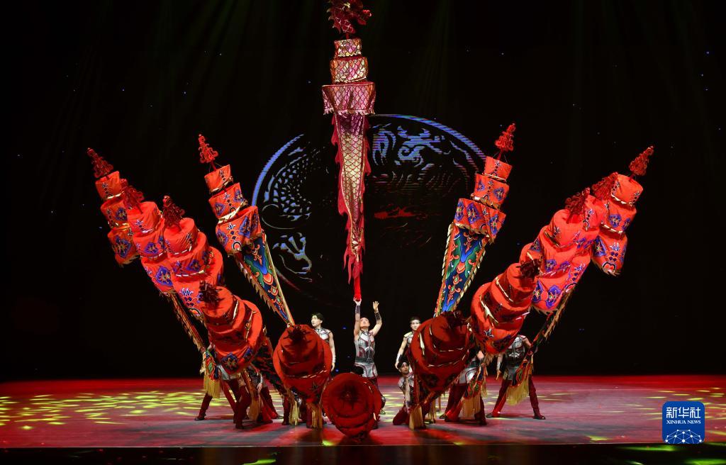 3月28日,在位于山東省濟南市的山東省會(huì )大劇院,演員表演雜技節目《龍躍神州·中幡》。