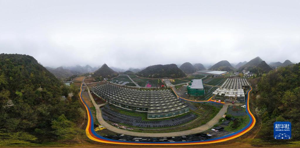 3月28日拍攝的貴州省畢節市百里杜鵑管理區匯境花卉基地(無(wú)人機全景照片)。