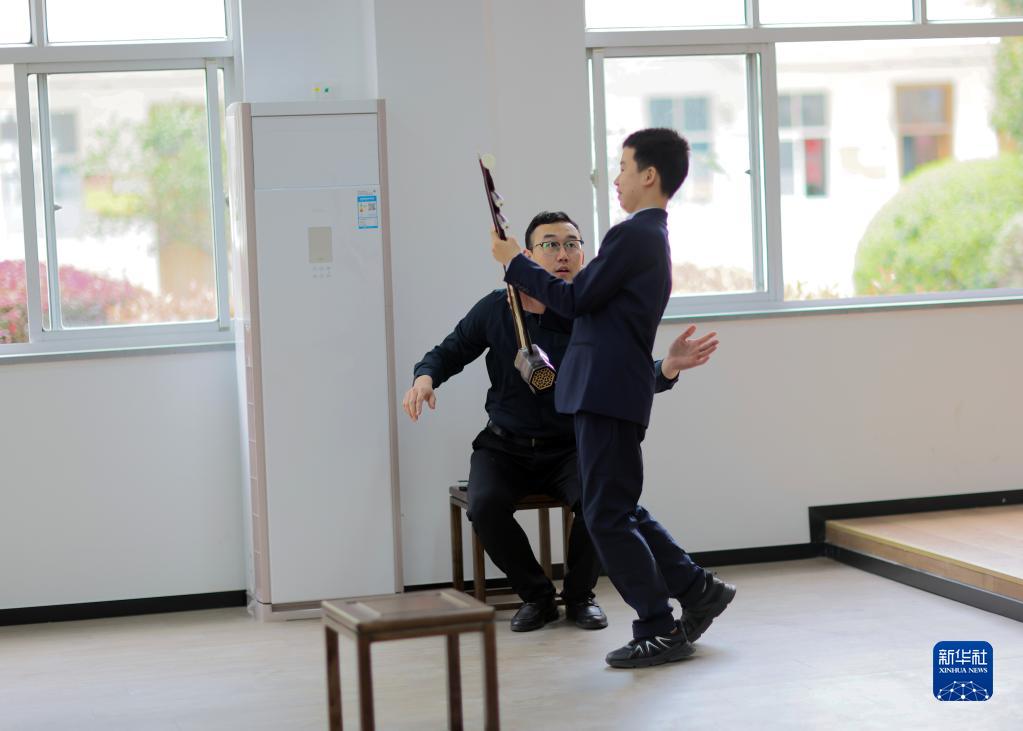 3月29日,在江蘇無(wú)錫梅村實(shí)驗小學(xué),二胡老師紀海軍在鼓勵學(xué)生陳宇豪。