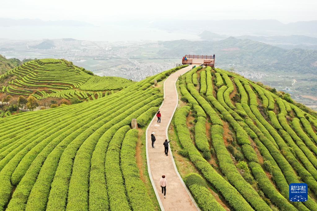 游客在福建省連江縣長(cháng)龍鎮高山茶園參觀(guān)(3月28日攝,無(wú)人機照片)。
