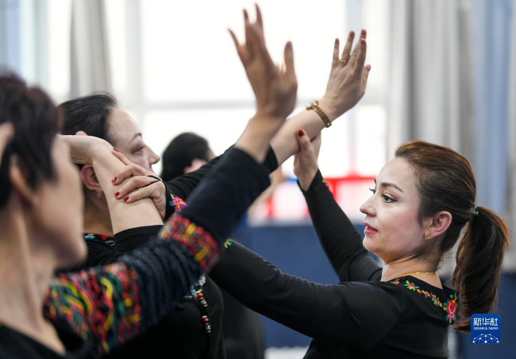 3月23日,舞蹈老師米拉(右)在民族舞課上糾正學(xué)員動(dòng)作。