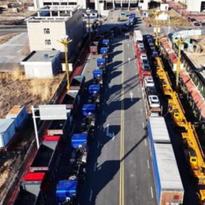 3月29日,來(lái)自哈薩克斯坦的貨車(chē)和即將出口的車(chē)輛在巴克圖口岸執勤民警引導下有序出境(無(wú)人機照片)。