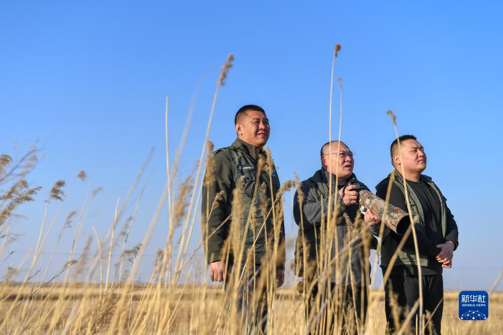 3月28日,在吉林省白城市鎮賚縣濕地,中國野生動(dòng)物保護協(xié)會(huì )吉林白城護飛隊隊員王凱(左)、姜海濤(中)和劉聰觀(guān)察候鳥(niǎo)棲息狀態(tài)。