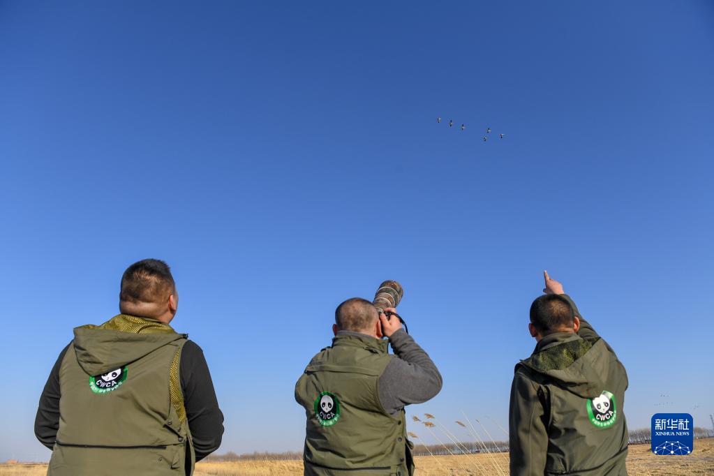 3月28日,在吉林省白城市鎮賚縣濕地,中國野生動(dòng)物保護協(xié)會(huì )吉林白城護飛隊隊員王凱(右)、姜海濤(中)和劉聰觀(guān)察、拍攝候鳥(niǎo)遷徙。
