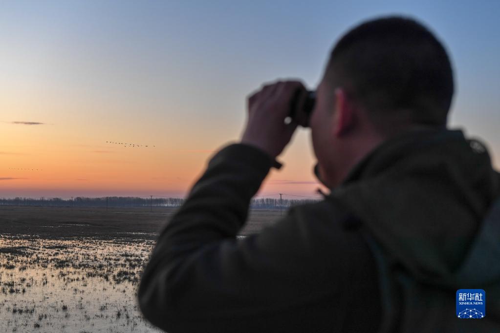 3月29日,在吉林省白城市鎮賚縣濕地,中國野生動(dòng)物保護協(xié)會(huì )吉林白城護飛隊隊員王凱觀(guān)察候鳥(niǎo)棲息狀態(tài)。