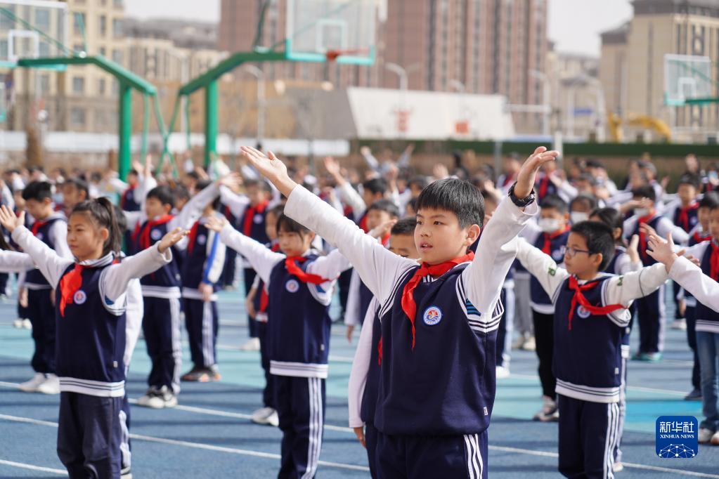 雄安新區容西片區云溪小學(xué)的學(xué)生在操場(chǎng)上做操(3月23日攝)。