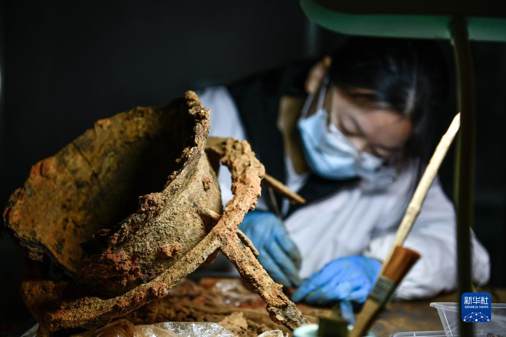 3月30日,在貴州貴安新區大松山墓群文物臨時(shí)庫房,文物保護專(zhuān)業(yè)的學(xué)生在清理出土的鐵器類(lèi)文物。