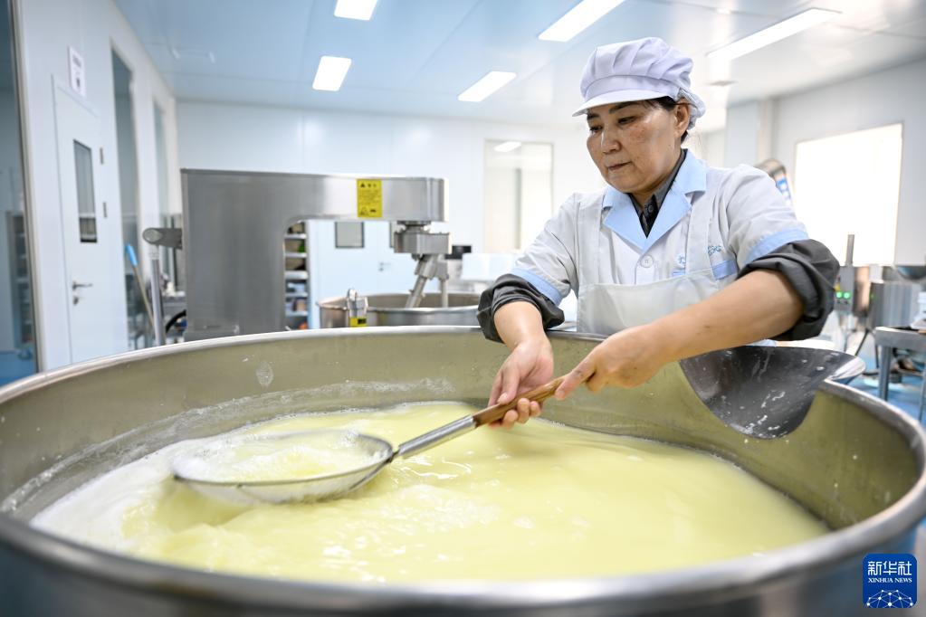 3月31日,在鑲黃旗民族傳統奶制品產(chǎn)業(yè)園的一家奶制品企業(yè)生產(chǎn)車(chē)間,工作人員在過(guò)濾奶渣。