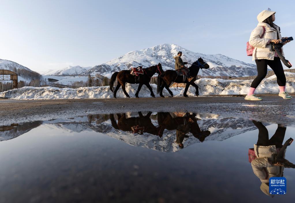 3月29日,一名村民騎馬從旅游者身旁走過(guò)。