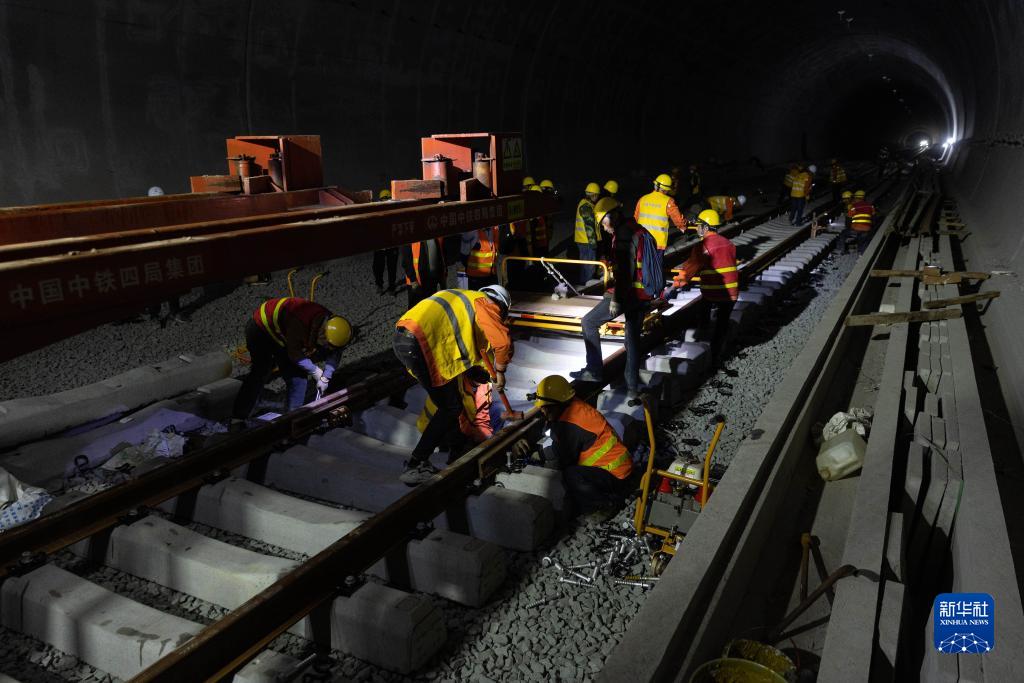 在漢巴南鐵路東華山隧道里,中鐵四局的施工人員在鋪設軌道(3月30日攝)。