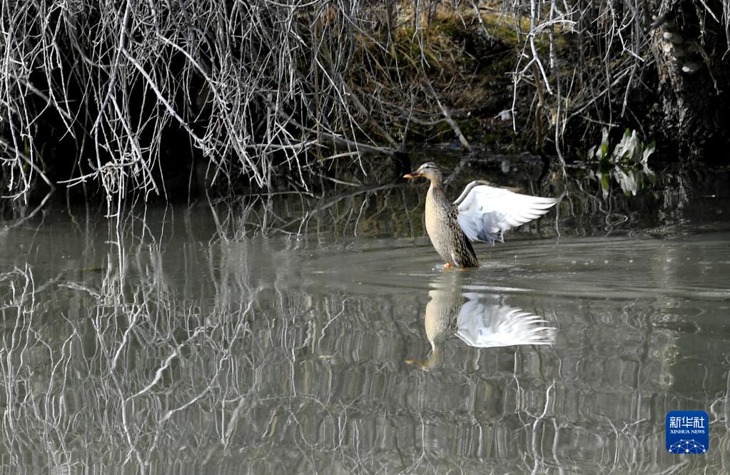 野鴨在拉魯濕地舒展翅膀(3月30日攝)。