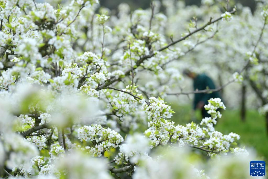 3月31日,湖北省恩施土家族苗族自治州宣恩縣椒園鎮黃坪村的梨農在給梨樹(shù)進(jìn)行人工授粉。