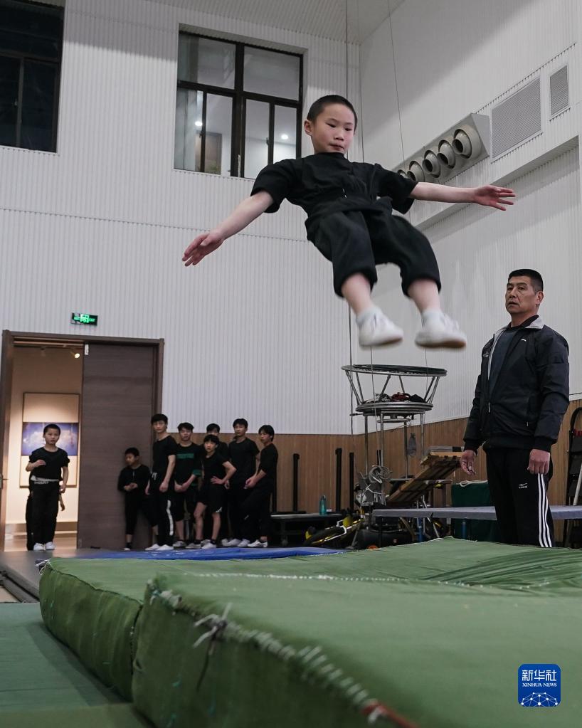 3月31日,小演員在位于江蘇省鹽城市建湖縣的江蘇省雜技團訓練。