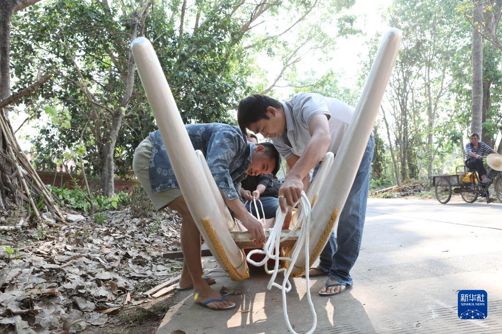 4月1日,景洪市勐罕鎮曼搭村村民在為龍舟扎龍頭。