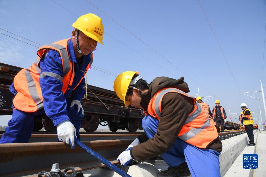 4月1日,中鐵四局集團工作人員在萊榮鐵路鋪軌施工現場(chǎng)鋪設軌道。