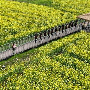 4月1日,游客乘坐田野小火車(chē)在油菜花地里感受春日美景。
