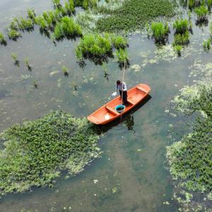 4月1日,村民在常寧市板橋鎮南洋村“稻蝦共養”生態(tài)農業(yè)基地里巡查(無(wú)人機照片)。