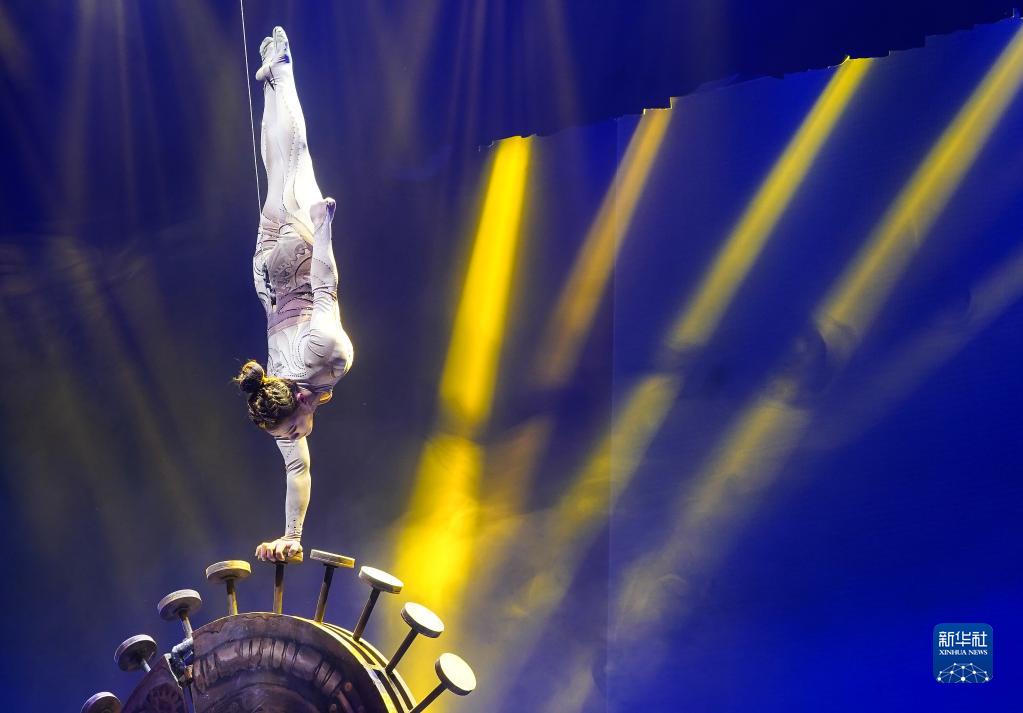 3月31日,在江蘇省鹽城市建湖縣,雜技演員王夢(mèng)塵在表演雜技節目《煉——倒立技巧》。