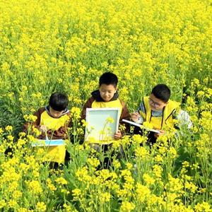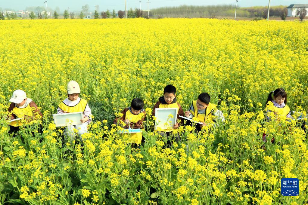 4月1日,在汝陽(yáng)縣三屯鎮東保村千畝油菜花田,小學(xué)生坐在花叢中寫(xiě)生。