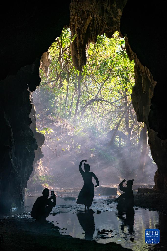 耿馬縣民族歌舞團團長(cháng)王峰(左)在拍攝傣族女創(chuàng )拳小視頻(3月23日攝)。