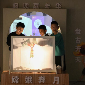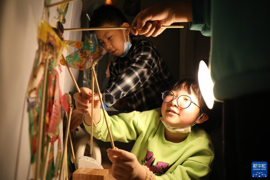 4月1日,在甘肅省蘭州市的讀者出版集團數字閱讀中心讀者小站,小朋友體驗中國神話(huà)故事主題皮影戲。