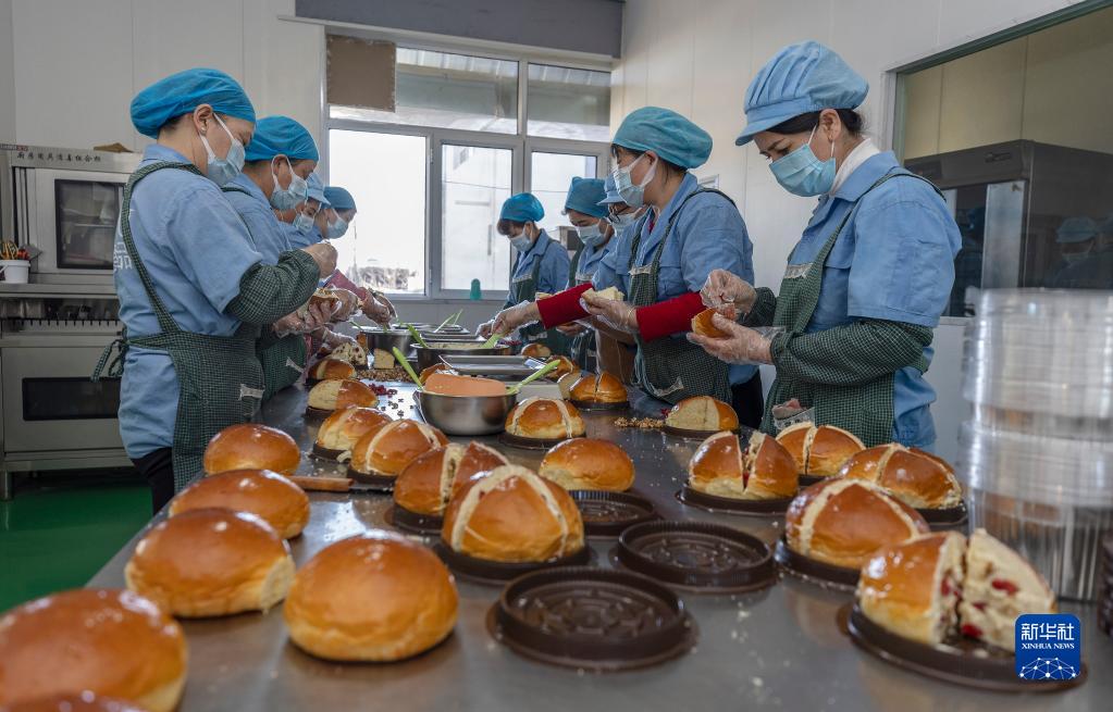 4月1日,在塔城市疆趣食品坊,員工們在制作“塔城奶酪包”。