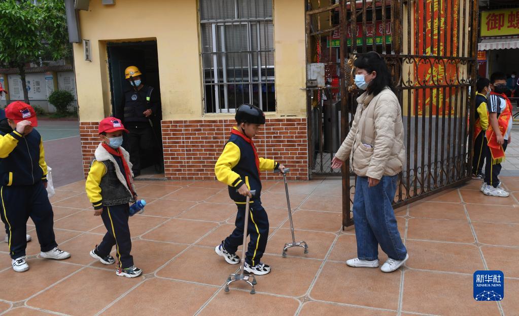 在廣西南寧高新區龍華學(xué)校,何冬艷放午學(xué)后領(lǐng)著(zhù)她照顧的學(xué)生準備走出校園(3月31日攝)。