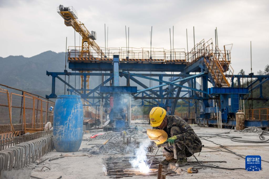 4月3日,中鐵二十四局的工人在杭溫鐵路陡門(mén)溪特大橋上施工。陡門(mén)溪特大橋連續梁于4月1日凌晨順利合龍。