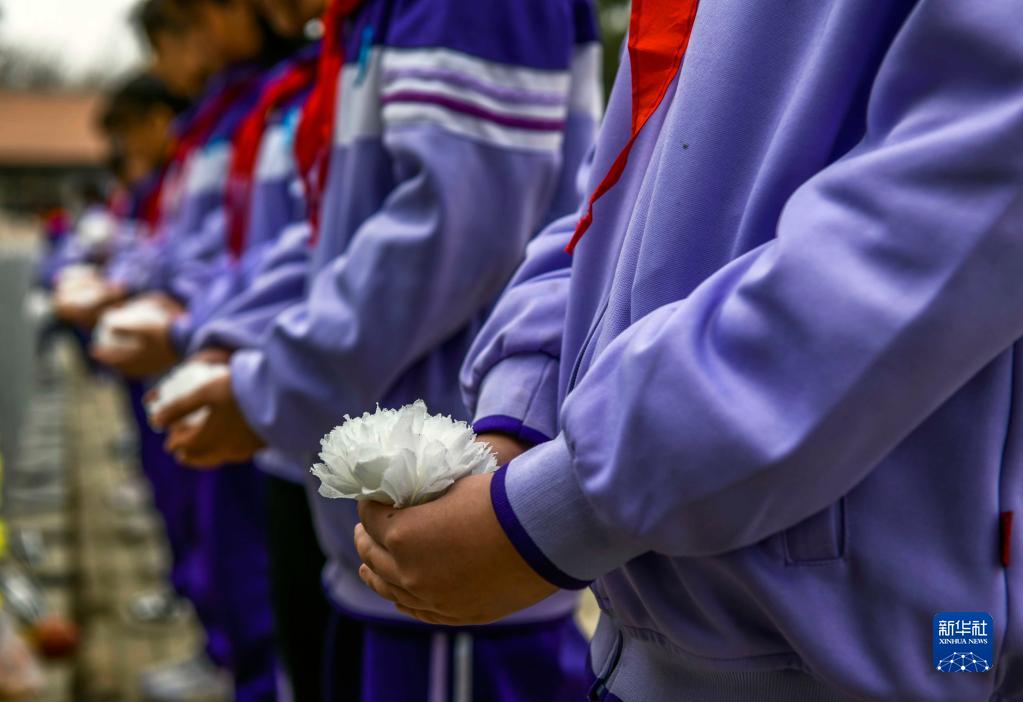 4月3日,學(xué)生在河北省遵化市鐵廠(chǎng)鎮甲山烈士陵園獻花。