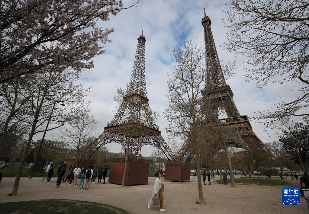 這是4月3日在法國巴黎拍攝的埃菲爾鐵塔(右)和“小埃菲爾鐵塔”。