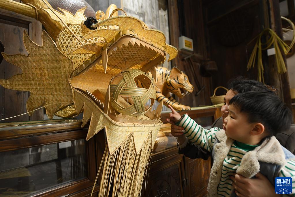 4月3日,村民帶著(zhù)小孩在姜鵬工作室里串門(mén),孩子被竹編的龍頭吸引。新華社記者 翁忻旸 攝