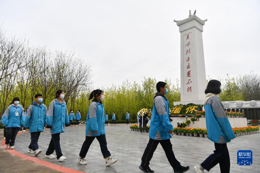 4月4日,在陜西省興平市烈士陵園,興平市秦嶺中學(xué)學(xué)生繞烈士紀念碑一周,緬懷英烈。