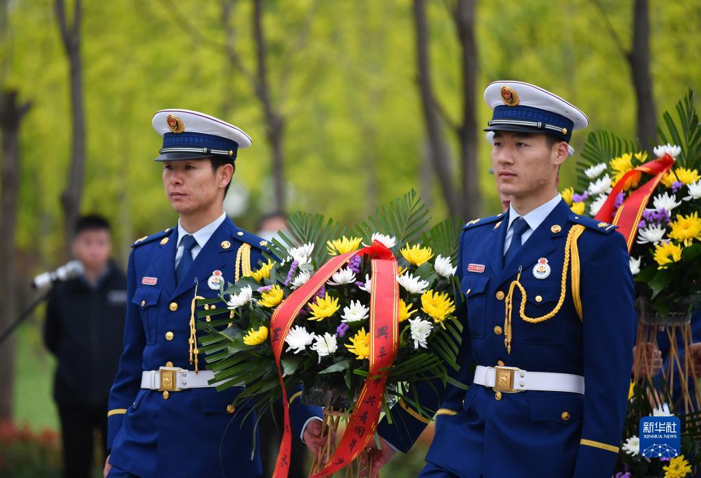 4月4日,在陜西省興平市烈士陵園,消防救援人員向烈士紀念碑敬獻花籃。