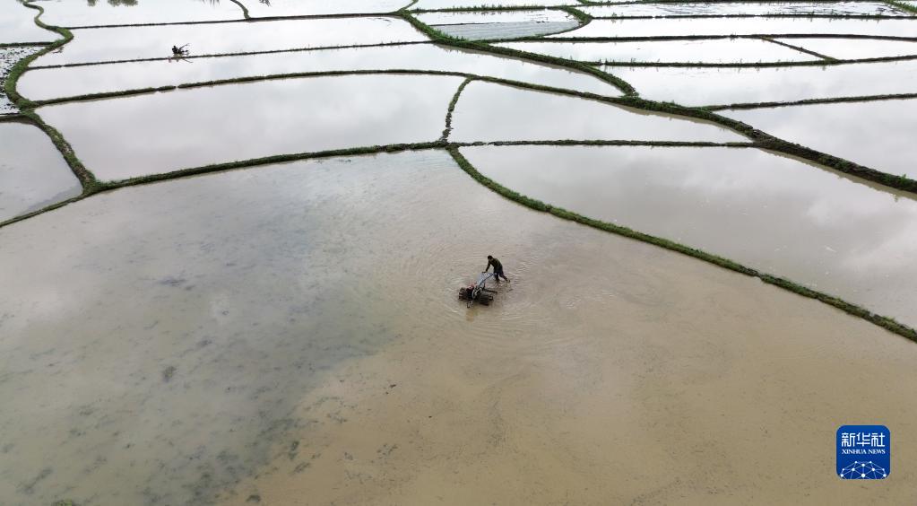 4月4日,廣西賀州市平桂區鵝塘鎮錦塘村農民操作手扶拖拉機犁田(無(wú)人機照片)。