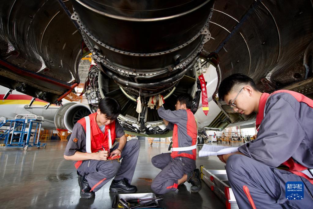 3月31日,在海南自貿港一站式飛機維修產(chǎn)業(yè)基地內,進(jìn)境飛機接受飛機發(fā)動(dòng)機、應急設備等多項檢修項目。
