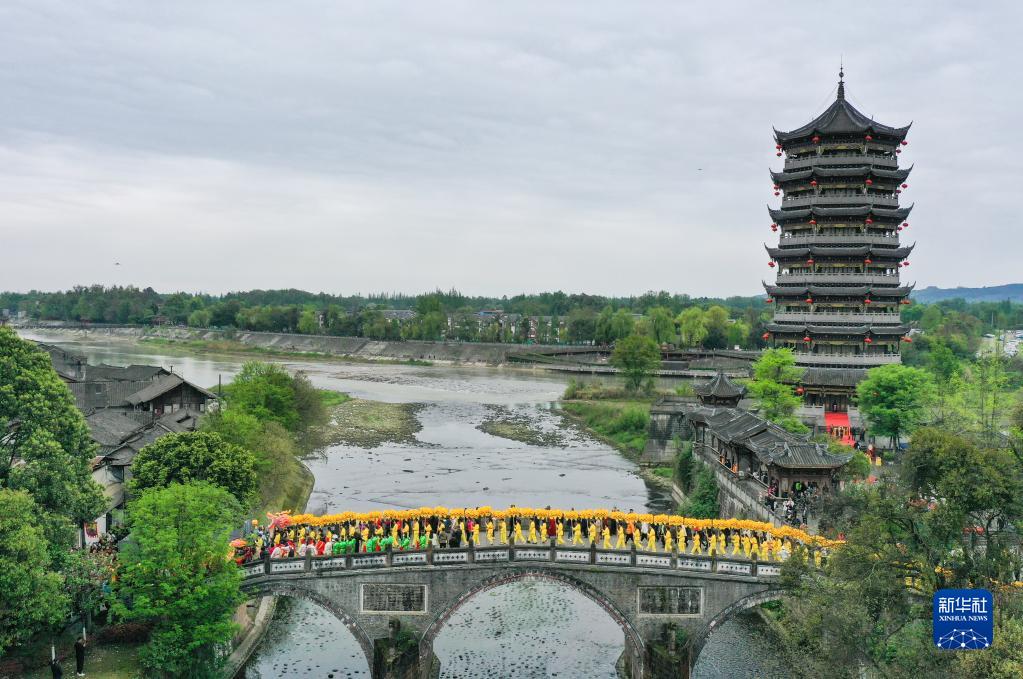 當日,崇州元通清明春臺會(huì )在四川成都崇州市元通古鎮拉開(kāi)帷幕。由269人手舉269截龍身匯聚成的“匯江老龍”,在古街上巡游。