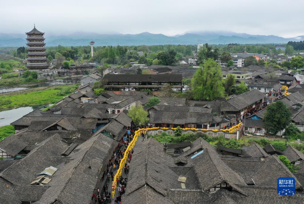 這是4月5日在成都崇州市元通古鎮拍攝的“匯江老龍”巡游隊伍(無(wú)人機照片)。