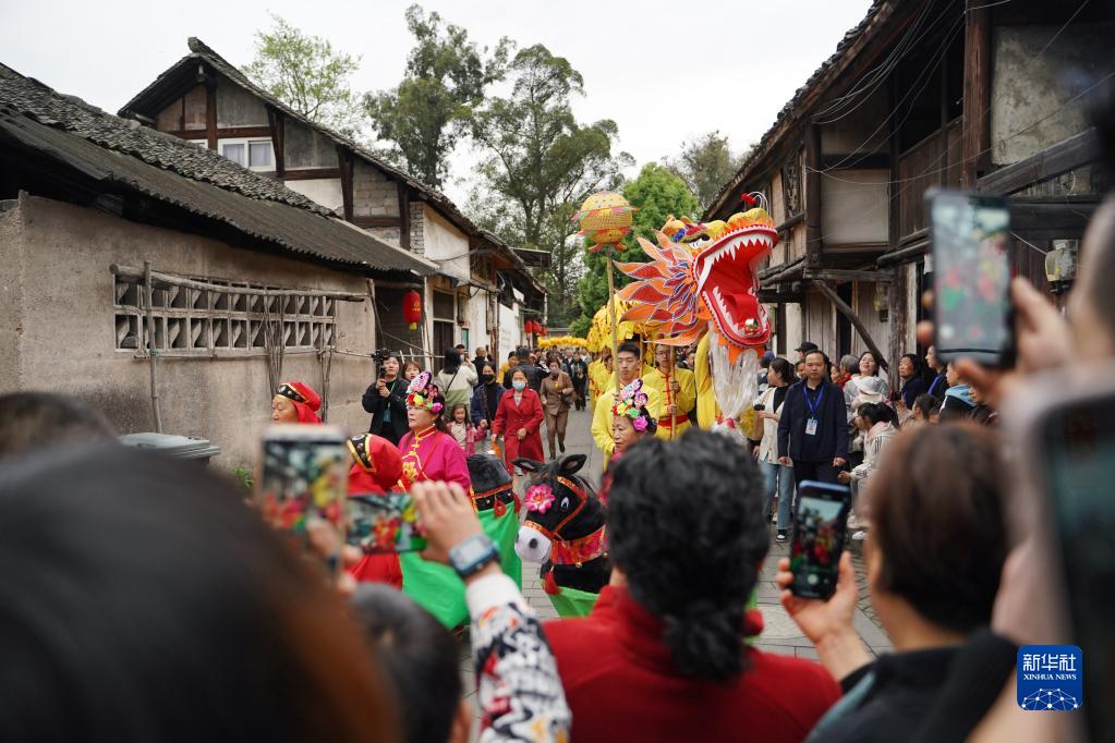 4月5日,游客在成都崇州市元通古鎮觀(guān)看“匯江老龍”巡游表演。
