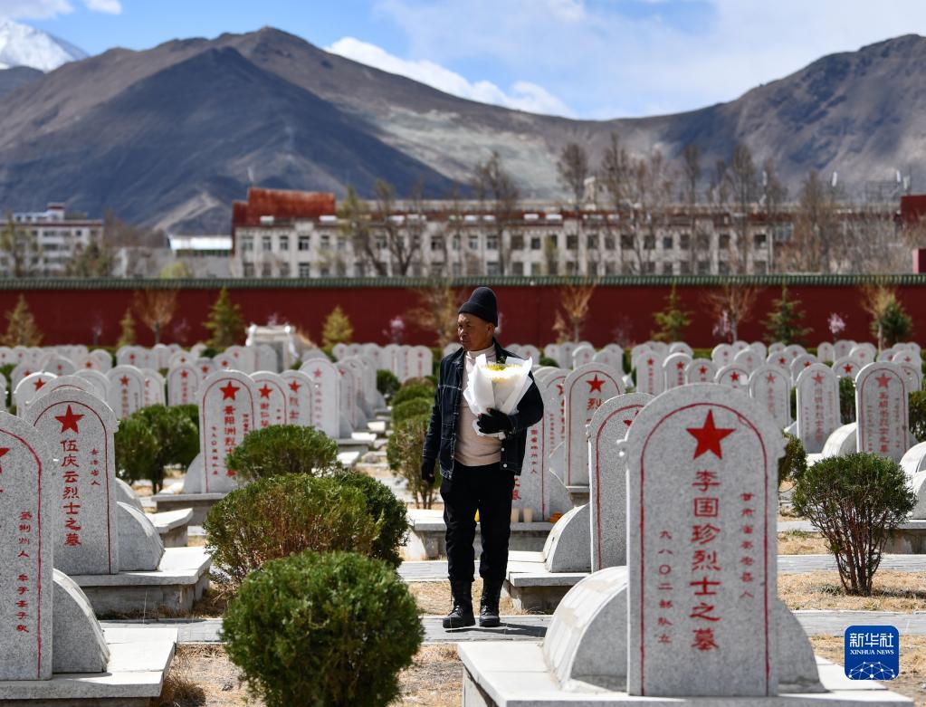 在拉薩烈士陵園,桑珠替無(wú)法前來(lái)拜祭的烈士家屬給烈士獻花(4月5日攝)。
