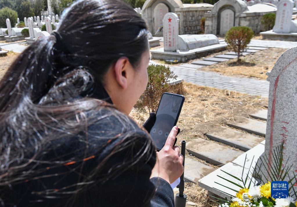 在拉薩烈士陵園,索朗拉姆和無(wú)法前來(lái)掃墓的烈士家屬視頻通話(huà),代為祭拜(4月5日攝)。