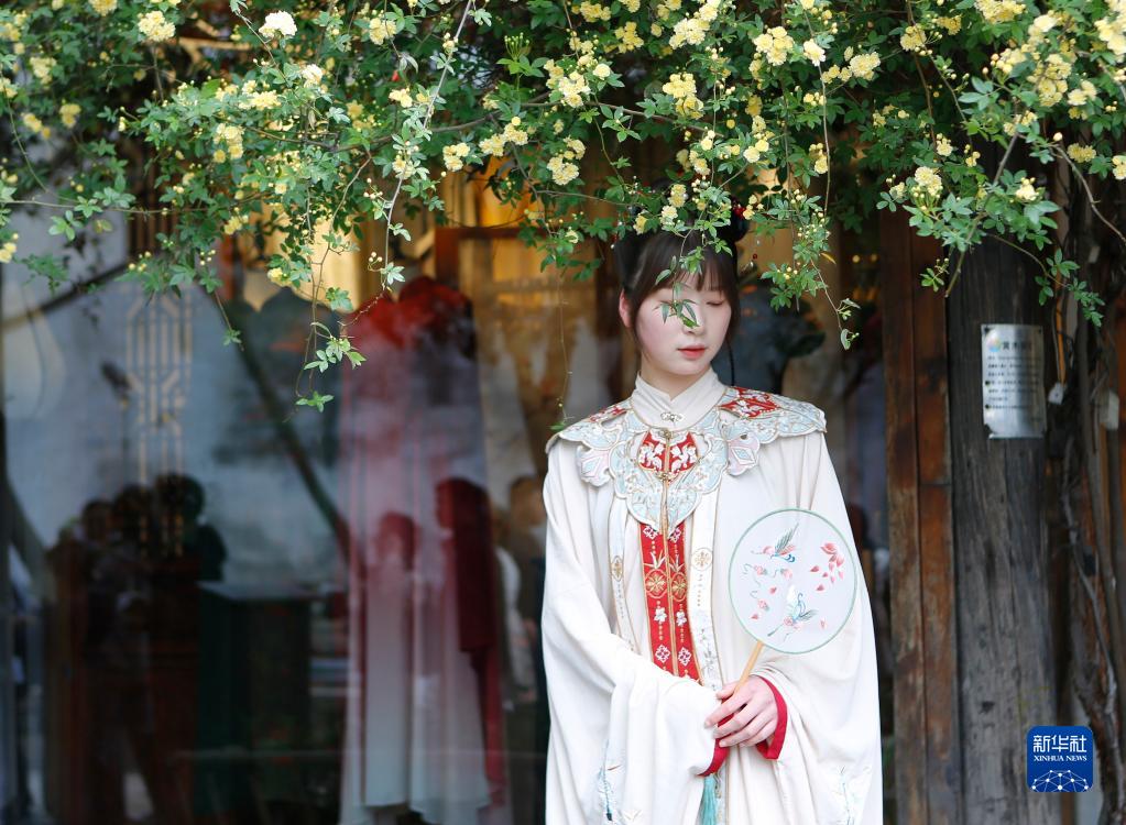 4月5日,游人在江蘇蘇州平江歷史街區留影。