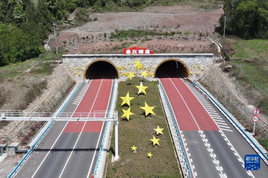 這是4月4日拍攝的鎮廣高速公路王坪至通江段春在隧道口(無(wú)人機照片)。