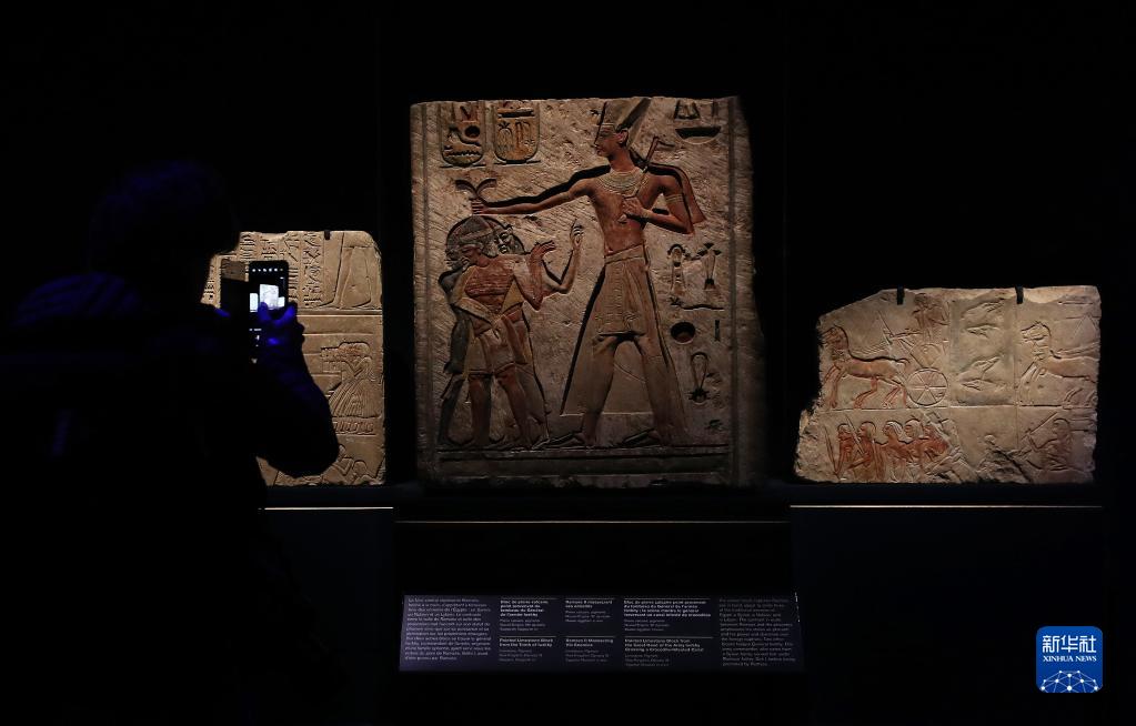 4月6日,媒體記者在法國巴黎參觀(guān)“拉美西斯和法老的黃金”埃及文物展。