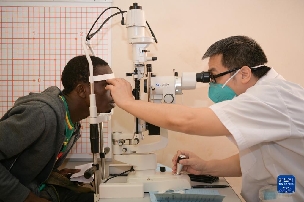 3月21日,在塞內加爾迪亞姆尼亞久兒童醫院,中國第19批援塞內加爾醫療隊眼科醫生嚴端為患者做檢查。