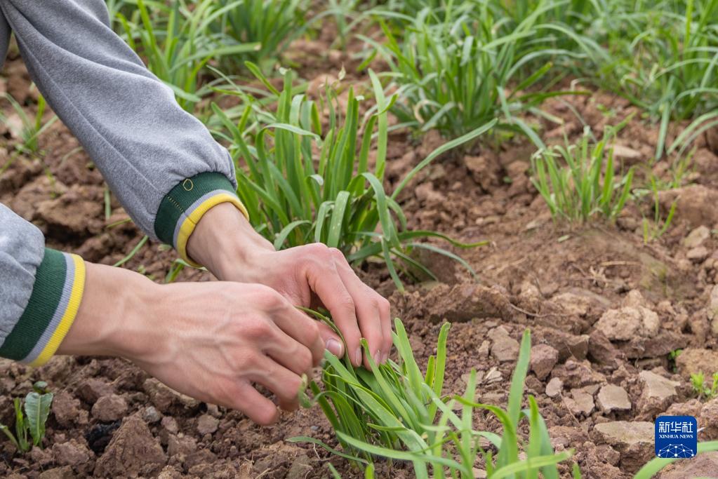 3月31日,在重慶廣陽(yáng)島,重慶市特殊教育中心的視力障礙學(xué)生在輕輕觸摸種植在地里的韭菜。