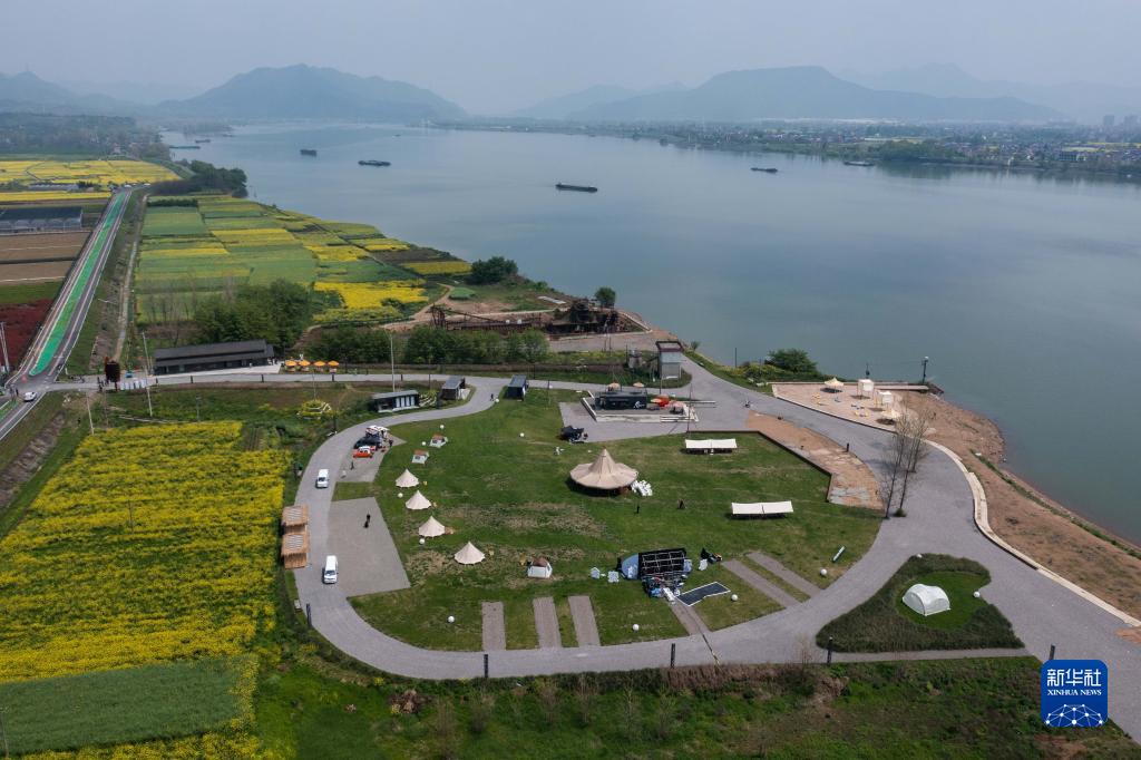 這是富春江畔的新桐鄉“山居鹿境”露營(yíng)基地(4月7日攝,無(wú)人機照片)。