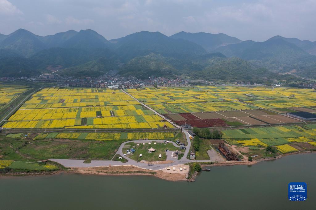 4月7日,富春江畔的新桐鄉“山居鹿境”露營(yíng)基地和近萬(wàn)畝油菜花田構成了春日美景(無(wú)人機照片)。